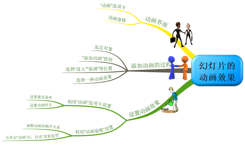 对于幻灯片的动画效果,主要包括两层含义,其一,是前面讲授的幻灯片的切换方式,其二,是页面内部对象的动画效果,即针对幻灯片内的每个对象,都能设置其动画效果。