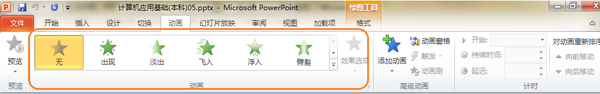在PowerPoint的顶部单击【动画】选项卡,就切换到了“动画”功能区状态。如图4-27所示。