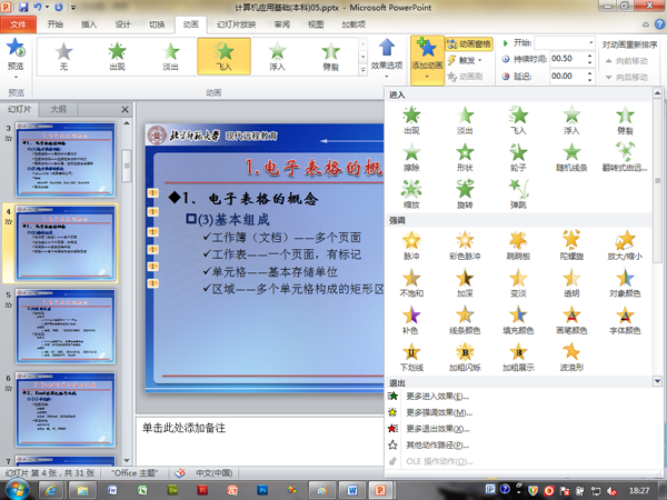其次,在【动画】选项卡中选择【添加效果】按钮,先确定服务类型子菜单,说明本动画服务于对象的哪种行为,可从【进入】、【退出】、【强调】等选择一种类型。例如,从【进入】区块中选择一种动画效果。如图5-29所示。