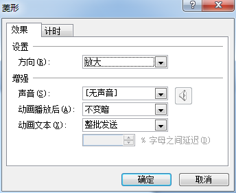 在【效果选项】对话框中,在其【效果】选项卡下,能够设置动画的方向,设置动画播放过程中是否播放声音,设置在动画播放后,是否把幻灯片变暗(或者隐藏对象);在其【计时】选项卡中,则能够设置与时间相关的配置项。