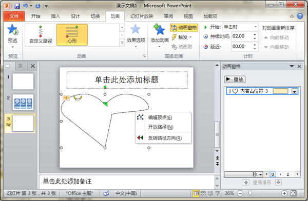 第七,在图5-32所示的界面中,右单击动作路径(心形的虚线),在弹出的快捷菜单中选择“编辑顶点”,重新修改图5-32中的路径,使之符合要求。