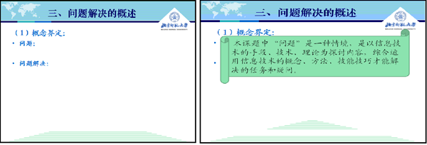 技巧1:在幻灯片放映过程中,首先呈现如图5-33左图所示的两个标题,当单击鼠标时,弹出一个卷轴,呈现出第1个主题“问题”的详细解释。如图5-33的右图所示。再次单击鼠标时,右图中的卷轴消失,并自动地弹出一个新卷轴,在新卷轴中呈现出对第2个主题“问题解决”的详细解释信息。如果再次单击鼠标,则第2个卷轴也消失了。