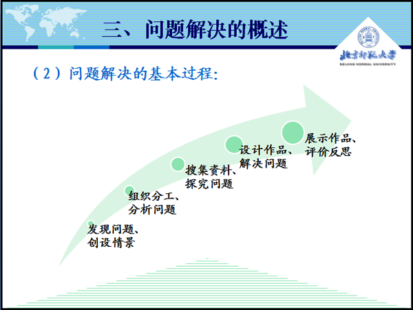 第十,对于第5张幻灯片中的【向上箭头】图形,单击其左侧的【展开文本框】标记,可打开其文本输入框。在它的文本框中输入相应的文字“发现问题、创设情景”、“组织分工、分析问题”等。然后,还可利用窗口顶部的【SmartArt工具-设计】为当前的SmartArt图形设置颜色、立体效果,使【向上箭头】图形变得更加美观。