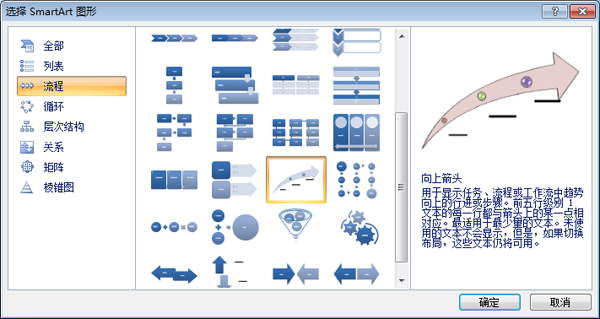 第九,从图5-35窗口的左侧栏目中选择【流程】,然后在右侧栏目内选中【向上箭头】图标。此时,就在幻灯片中新增了一个类似于向上箭头的SmartArt图形。